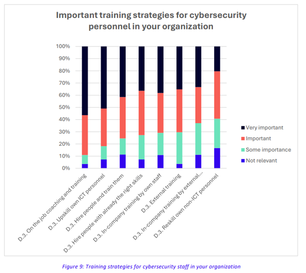 Interestingly, the least relevant training strategy was found to be 'Reskill own non-ICT personnel,' with 41% of respondents finding it 'not relevant' or only of 'some importance.' However, the report suggests that, given the severe shortage of cybersecurity experts, this approach—which involves converting staff from areas such as banking or manufacturing—is a pathway worth exploring to tap into unique domain expertise.
